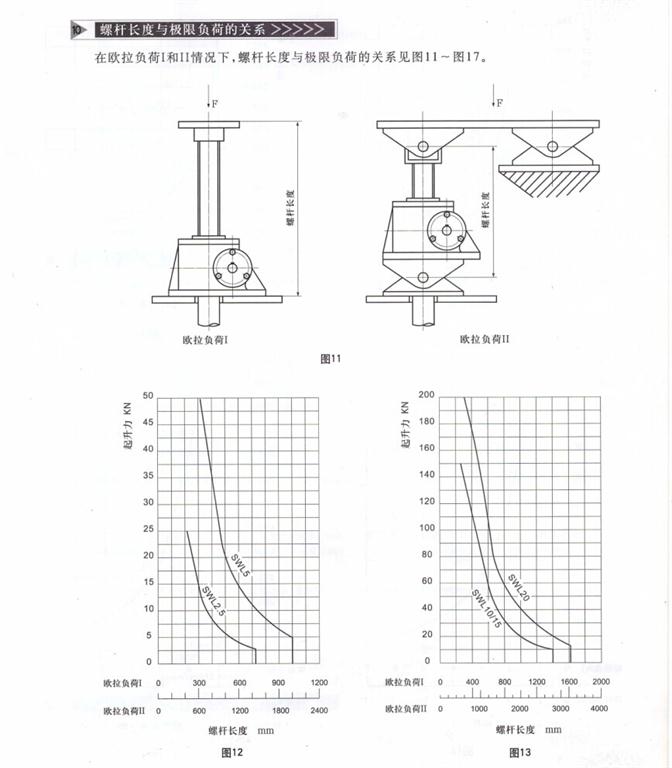 圖下給出了允許彎曲力矩下,絲桿長度與極限負(fù)荷的關(guān)系,根據(jù)絲桿行程和起升負(fù)荷,查出所需升降機(jī)的型號(hào)。